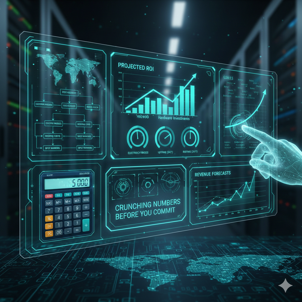 We run the numbers on investment opportunities, building custom models to evaluate ROI on hardware investments, hosting costs, and reward projections. It's all about crunching electricity rates, uptime, and revenue forecasts to help you forecast ROI before committing.